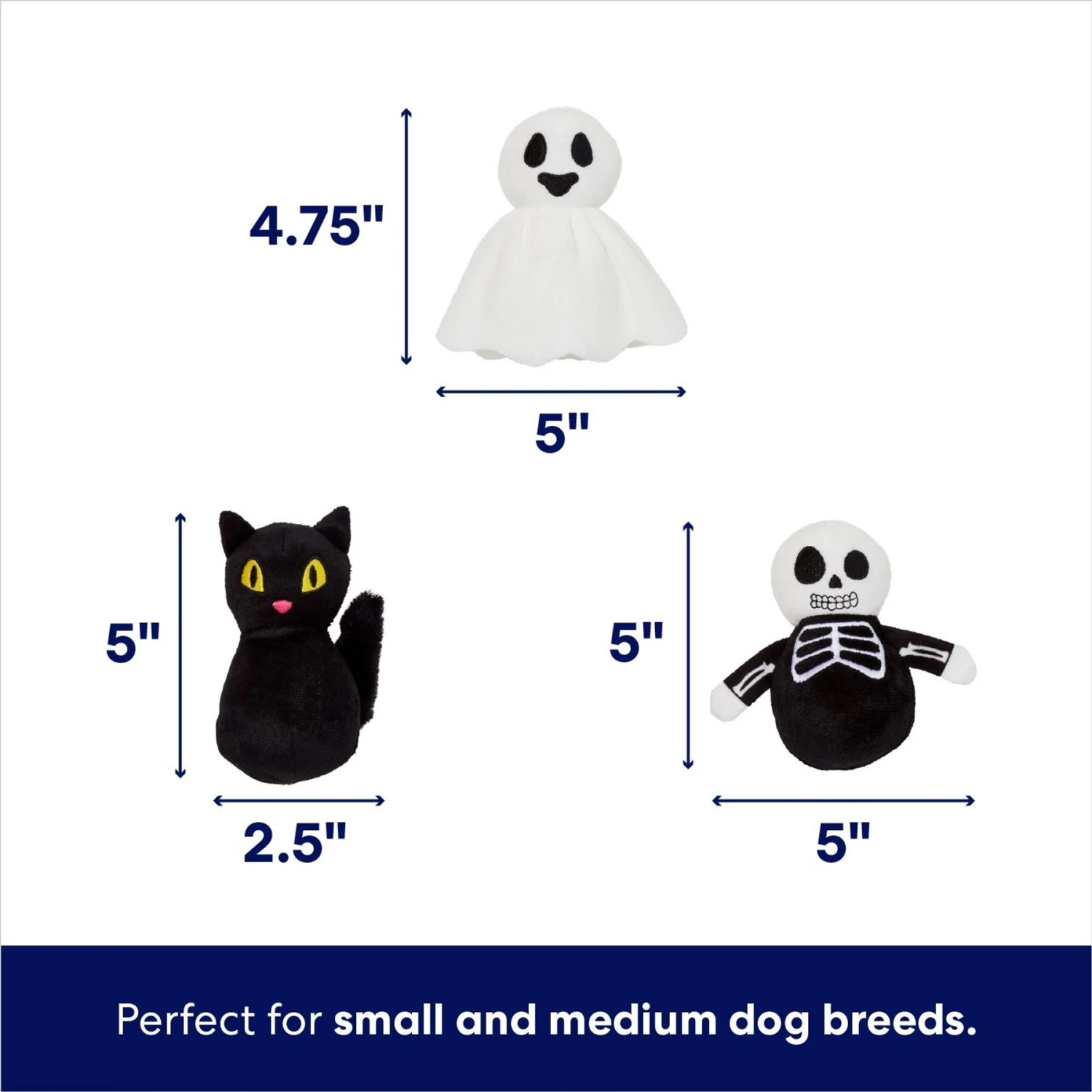- Plush puzzle toy set comes with plush haunted shack and three insertable toys—a ghost, a black cat and a skeleton, each with a squeaker to keep your dog’s attention.